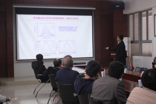 讲座中雷炳富以《发光碳点的植物应用》为题进行讲授。他指出其团队通过荧光碳点在豆芽体内的植物毒性、吸收及转运为例,进而探究碳点影响。讲学PPT中的大量数据及图片,让大家直观了解到碳点对植物体体内的生长影响和发光碳点在植物体体内的荧光成像。随后他谈到通过“对碳点、纤维素复合物及其植物成像研究”、“硅烷化碳点的黄瓜苗吸收及生物毒性研究”、“碳点菜心吸收与富集生理效应、上转换NaYF4:Yb,Er@CDs植物吸收及生理效应、碳点解除除草剂2,4-D植物毒性、丹参为原料制备碳点用作生菜盐胁迫中的氧化损伤活性氧清除剂、碳点对番茄生菜生长发育调控及抗氧化机制研究”等大量实例为鉴,进而摸索得出具体研究方案。