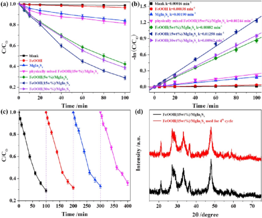 图3. FeOOH/MgIn2S4异质结的光催化污染物降解性能。