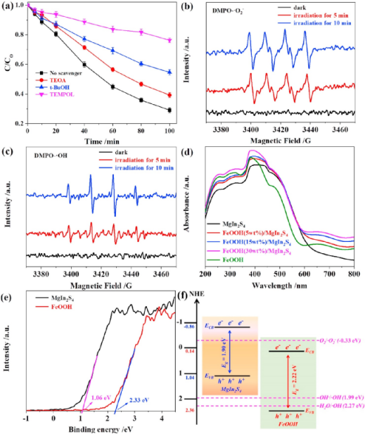文章要点3:如此优异的降解性能主要归因于FeOOH和MgIn2S4之间构建的S型异质结,这不仅可以加速光生载流子的分离,而且还可以保留光生电子对MgIn2S4的强还原能力,以及光生空穴对FeOOH的高氧化能力,有力地促进空穴、超氧化物和羟基自由基等丰富活性物种的产生。