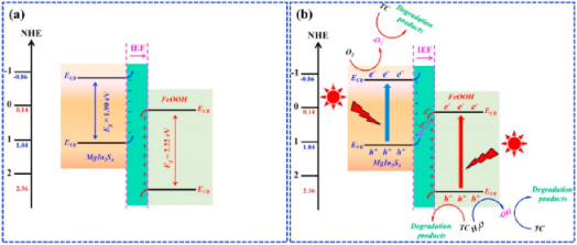 图6. S型FeOOH/MgIn2S4异质结在接触和可见光照射后的电荷转移机制示意图。