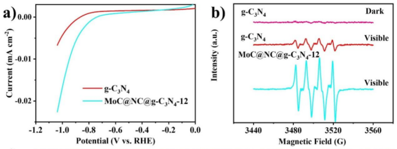 图8. g-C3N4和MoC@NC@g-C3N4-12的表征:a) 0.5 M Na2SO4溶液中的电催化HER极化曲线,b) DMPO−·O2−的EPR光谱。