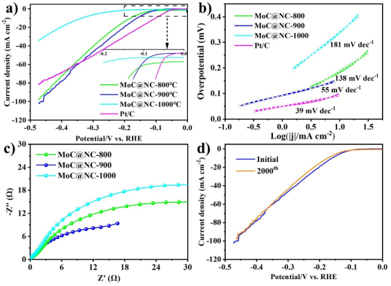 图3. a) MoC@NC催化剂的LSV曲线(图中插图为所选区域的放大视图),b)对应的Tafel图,c) Nyquist图。d) MoC@NC-900的循环稳定性