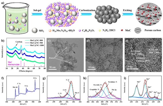 图2. a) MoC@NC催化剂的制备过程示意图。b) MoC@NC催化剂的XRD谱图。MoC@NC-900的c、d) TEM和e) HRTEM图像。f) MoC@NC-900的XPS全谱。MoC@NC-900的g) C 1s, h) N 1s, i) Mo 3d的高分辨率XPS光谱。