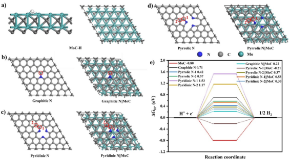图4. a、b、c、d) N掺杂碳、MoC和MoC@NC的结构模型。e) N掺杂碳、MoC和MoC@NC的HER自由能图