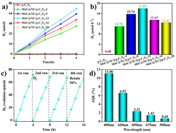 图6. a)不同光催化剂析氢的积累图,b)不同光催化剂析氢的平均速率。c) MoC@NC@g-C3N4-12的稳定性测试和d) AQE