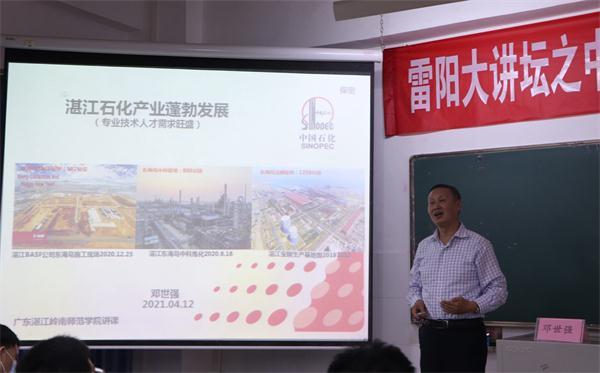 报告会上,邓世强以一段关于新时代湛江经开区社会发展规划的录像为切入点,分别从我国炼化一体化的企业发展新格局、湛江东海岛BASF公司的乙烯项目、湛江东海岛中科炼化项目、湛江东海岛湛江宝钢项目、湛江东海岛“十四五”期间重点建设项目及广西钦州石化产业园项目六大方面展开报告介绍。讲述中通过多个层面维度分析了湛江石油炼化工业的发展优势,一一讲述中科炼化项目、湛江宝钢项目等项目概况规划,并援引多个例子分析东海岛化工石油能源的发展进程及前景,强调新时期化工专业技术人才培养的重要性和巨大市场需求。