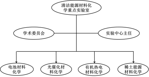 实验室组织结构:重点实验室设置学术委员会主任、实验室主任、实验室常务副主任、实验室副主任、实验室党支部书记、学术秘书各1名。研究单元按照研究方向分类,分别是储能材料化学方向、光电催化材料化学方向、有机热电材料化学方向、和稀土能源材料化学方向。