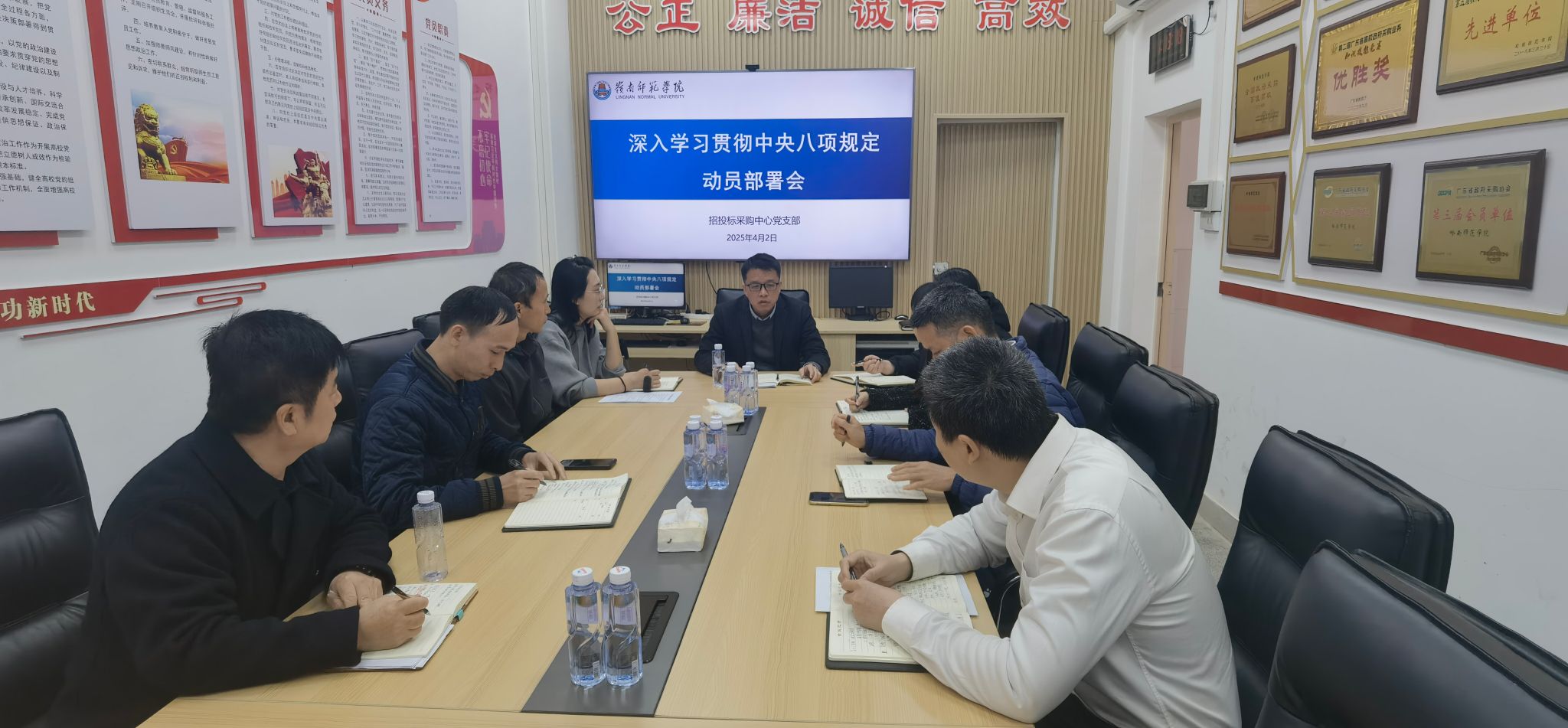 4月2日,招投标采购中心党支部召开深入贯彻中央八项规定精神学习教育部署动员会议,传达学习学校党委和机关党委《关于开展深入贯彻中央八项规定精神学习教育的实施方案》,以及学校启动部署会议精神,部署中心开展学习教育具体工作。会议由李亚九书记主持,中心全体人员参加。
