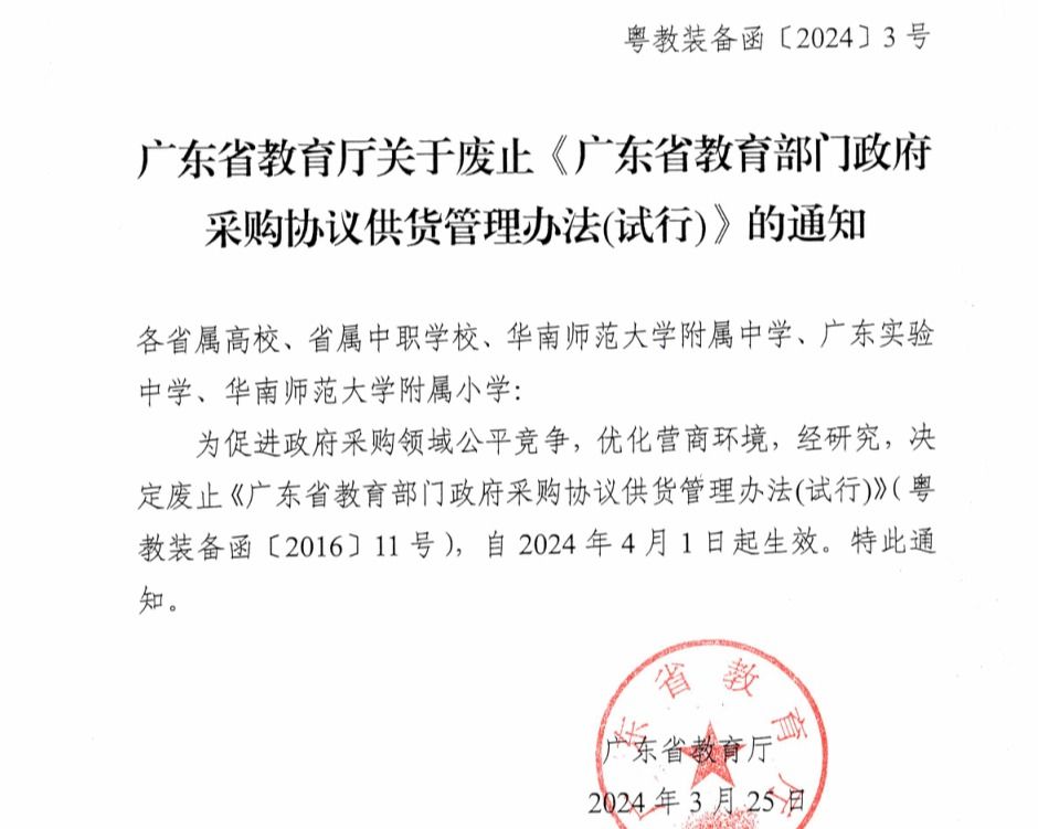 广东省教育厅关于废止《广东省教育部门政府采购协议供货管理办法(试行)》的通知