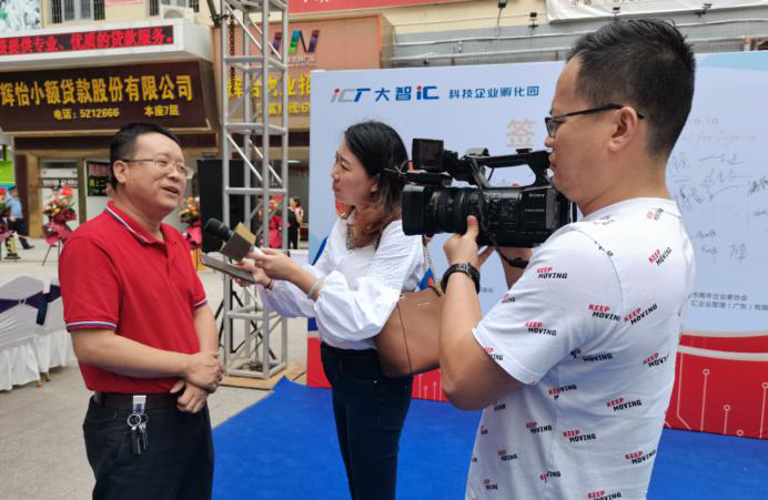 仪式开始之前,刘金祥教授现场接受湛江电视台采访,他指出,校地双创合作,可以充分发挥岭南师院的师生资源和教学科研优势,充分利用大智汇孵化园的物理空间和优惠政策,达成资源共享、优势互补,开发科技,开发海业的目标,为吴川籍师生以及紧临地区师生提供创业孵化的广阔空间,为当地的经济建设服务,添砖加瓦。