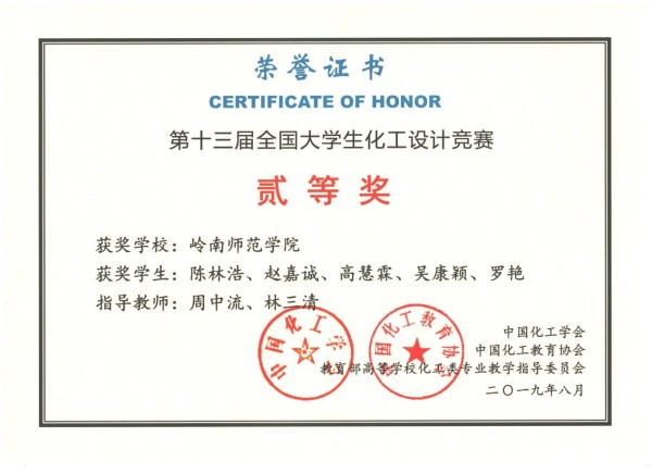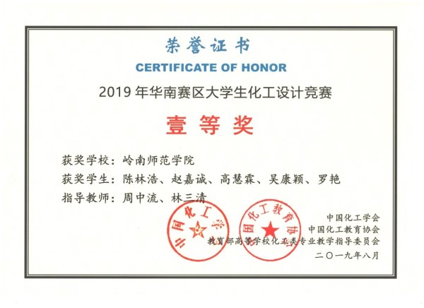 近日,由中国化工学会、中国化工教育协会、教育部高等学校化工类专业教学指导委员会主办的2019年“东华科技-恒逸石化杯”第十三届全国大学生化工设计竞赛落下帷幕。我校化学化工学院周中流、林三清老师指导,陈林浩、赵嘉诚、高慧霖、吴康颖、罗艳等5名同学组成的“东岛之炼”队荣获华南赛区一等奖、全国二等奖。