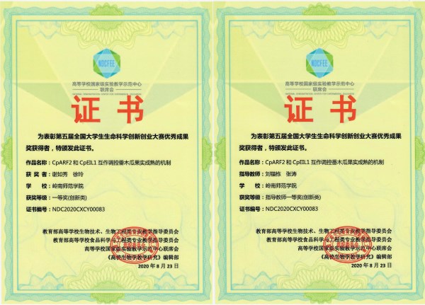 本届大赛生科院共选派了五项创新类作品参加竞赛。谢如秀、徐玲同学的《cparf2和cpeil1互作调控番木瓜果实成熟的机制》(指导老师:刘锴栋、张涛)参赛作品脱颖而出,入围公开决赛答辩并获得一等奖,该成果稍早前在国际知名植物学刊物《plant journal》发表;邓嘉欣、霍靖欣等同学的《谷胱甘肽化修饰对盐胁迫下番茄幼苗抗氧化系统的影响》(指导老师:周艳)获得三等奖。