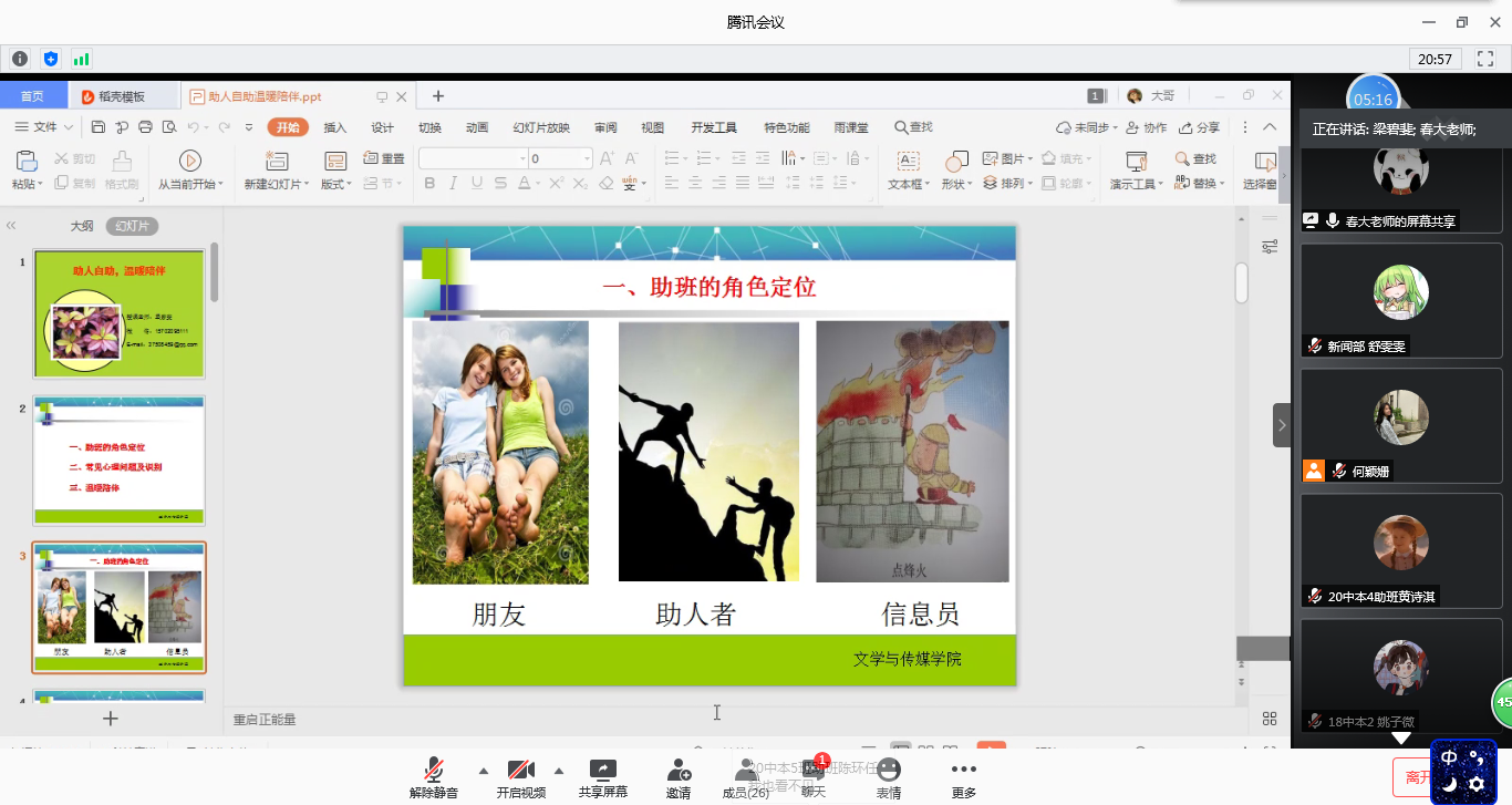 7月24日,文学与传媒学院在腾讯会议开展2020级新生助班素质能力提升系列专题培训。文传学院梁碧斐副书记、全体辅导员、19级优秀助班和20级新晋助班一同参加了本次专题培训。