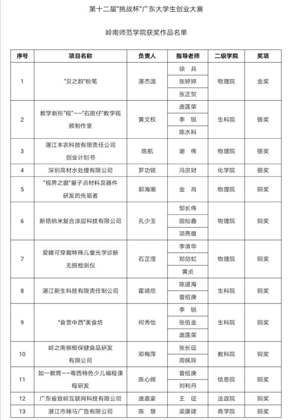 黄文权同学团队的“教学新形‘视’——‘石斑仔’教学视频制作室”、陈航同学团队的“湛江丰农科技有限责任公司创业计划书”和罗功铭同学团队的“深圳高材水处理有限公司”等3个项目获创业计划类银奖;郭海潮同学团队的“‘视界之窗’量子点材料及器件研发的先驱者”等7个项目获创业计划类铜奖;庞嘉豪同学团队的“广东省致岭互联网科技有限公司”等2个项目获创业实践类铜奖。