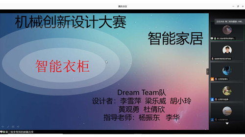 比赛分线上ppt讲解和线上答辩两个环节进行。由机电工程学院和信息工程学院31名学生分别组成的7个小组通过ppt讲解、动画视频展示,介绍了作品的结构和性能、工作原理、设计的创新性等。各支参赛队伍结合大赛主题,联系生活实际,提出了各种创意想法和方案,创新机械设计,如智能叠衣机、多功能鞋柜、智能衣柜、辅助式智能门锁、多功能智能家用饼机、智能婴儿床和智能隐形水槽等。