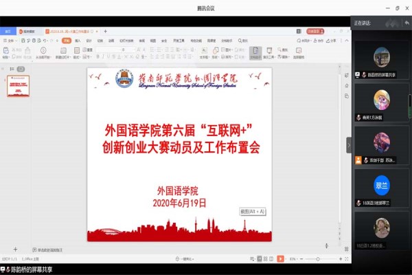 6月19日晚,外语院于腾讯会议开展了第六届“互联网+”创新创业大赛动员会及工作布置会,外国语学院党委书记陈永国、学工办全体辅导员老师、双创中心全体干部、以及17-19级全体班长和权益委员参与了本次会议,会议由陈韵桥老师主持。