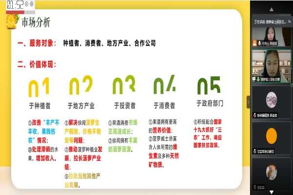 决赛分为5分钟的ppt项目陈述和3分钟的现场答辩两个环节。进入决赛的10支团队通过ppt以及视频的形式分别从项目可行性、产品或服务创意、市场前景、公司战略、财务盈利、预期效果等方面进行了详细讲解;在现场答辩环节,各参赛选手从容不迫地回答评委老师提出的问题,团队成员配合默契。其中“湛江海岛一点通”团队凭借着多样化的海岛旅游项目,夺得本次比赛的冠军。而“菠萝威士忌”团队结合徐闻菠萝优势以及乡村振兴战略发展药用性果酒,获得评委好评,夺得大赛的二等奖。