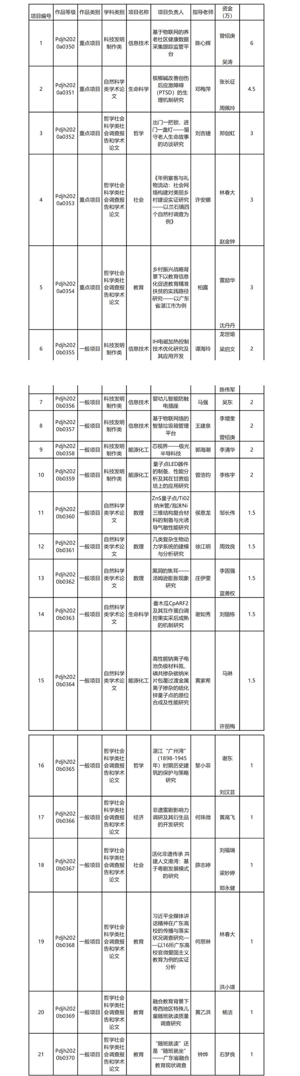 近日,团省委发布了《关于2020年广东省科技创新战略专项资金(“攀登计划”专项资金)拟资助立项项目的公示》,岭南师范学院推报的21个“攀登计划”项目全部获得立项,其中重点项目立项5项,一般项目立项16项,科技发明制作类首次获得重点项目立项,资助总金额达43万元,立项率首次达到100%,立项数量位于全省高校第7,资助金额比去年增加了22万元。
