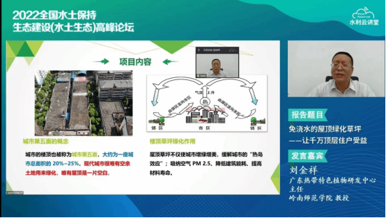 双创学院刘金祥教授应邀参加论坛并做主题报告:免浇水的屋顶绿化草坪——让千万顶层住户受益。他首先介绍了项目的研究背景,党的十八大、十九大报告都十分关注生态文明,重视美丽中国建设,习近平主席指出,山水林田湖草沙是生命共同体,凸显了小小草、大生态的新时代特征。