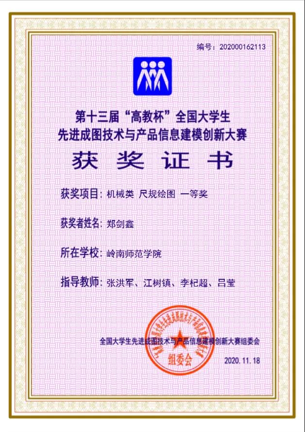 我校参赛队伍由创新创业学院张洪军老师、机电工程学院江树镇、李杞超、吕莹老师带队指导,机电工程学院郑剑鑫,梁晓雯,崔子怡,邹樱兰,钟紫珊,胡翠雯等同学作为参赛队员,通过为期一年半的积极备战和紧张训练,最终在比赛中取得好成绩,既充分展现了我校学生在尺规绘图、计算机建模、3d打印等方面的动手与创新能力,又体现了我校专业教师的教学水平和师生的团结协作精神,也提升了岭南师范学院机械工程学科相关图学教育在全国各高校中的地位和影响力。经过激烈角逐,我校代表队获得个人一等奖2项,二等奖4项,以全国排名第69的成绩获得机械类团体二等奖,刷新我校历史成绩。同学能够取得卓越成绩离不开指导老师的辛勤付出以及谆谆教诲,张洪军、江树镇、李杞超、吕莹老师均获得机械类优秀指导老师二等奖。