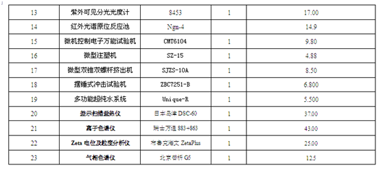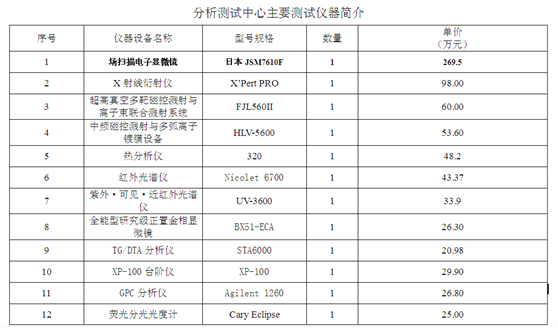 分析测试中心现拥有扫描电子显微镜、X射线衍射仪、傅里叶变换红外光谱仪、离子色谱仪、紫外可见近红外光谱仪、正置金相显微镜、荧光分光光度计、气相色谱仪、GPC分析仪、热分析仪等33台适用学科广,通用性强,技术水平先进的大型分析测试仪器设备。中心下设四个测试实验室(微区结构分析室、光谱分析室、质谱分析室、物性分析室),测试服务范围覆盖微区形貌、成分与结构分析、物相分析、 热分析、力学性能分析、材料理化性能检测等。