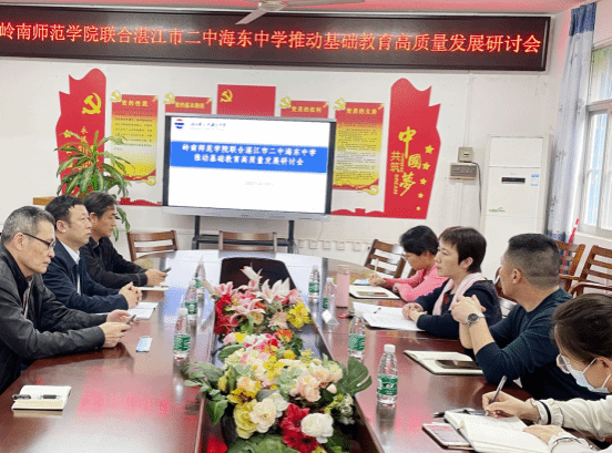 为贯彻落实《岭南师范学院赋能基础教育高质量发展行动方案》,全面实施“三成四化”筑峰工程,紧密对接粤西基础教育高质量发展的实际需求,4月19日,法政学院副院长娄伟、思政部系主任谢锦江、历史部系主任景东升、辅导员孟玉新等人赴湛江市二中海东中学开展推动基础教育高质量发展专项调研,本次调研活动以座谈会的形式开展,法政学院一行以及湛江市二中海东中学校长张筱柳及其相关科室负责人参加了本次座谈会。