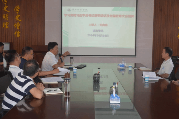 10月16日,在第三教学楼313会议室,法政学院党委召开理论学习中心组学习(扩大)会暨教职工政治理论学习会,学习贯彻全国教育大会精神。法政学院党委书记李德深主持会议,院长刘鑫淼作专题学习辅导报告。