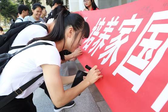 在庄严肃穆的烈士陵园内,“爱我湛江”历史知识服务队的宣讲员们围绕纪念碑的历史缘由、乐民起义的过程以及革命英雄朱也赤的故事,向学员们讲述烈士们英勇抗战、保卫广州湾的辉煌事迹,为学员们展现了先烈们浓厚的家国情怀和勇于抗战的革命精神。通过瞻仰烈士纪念碑,警示学员不忘先烈遗训,牢记新时代的使命与担当。为抒发着对革命先烈深情的敬意,学员代表满怀真诚地向纪念碑献上花圈,与此同时,现场学员用铿锵有力的声音宣读入团誓词,并于横幅上签字以示自身向党组织靠拢的坚定决心。