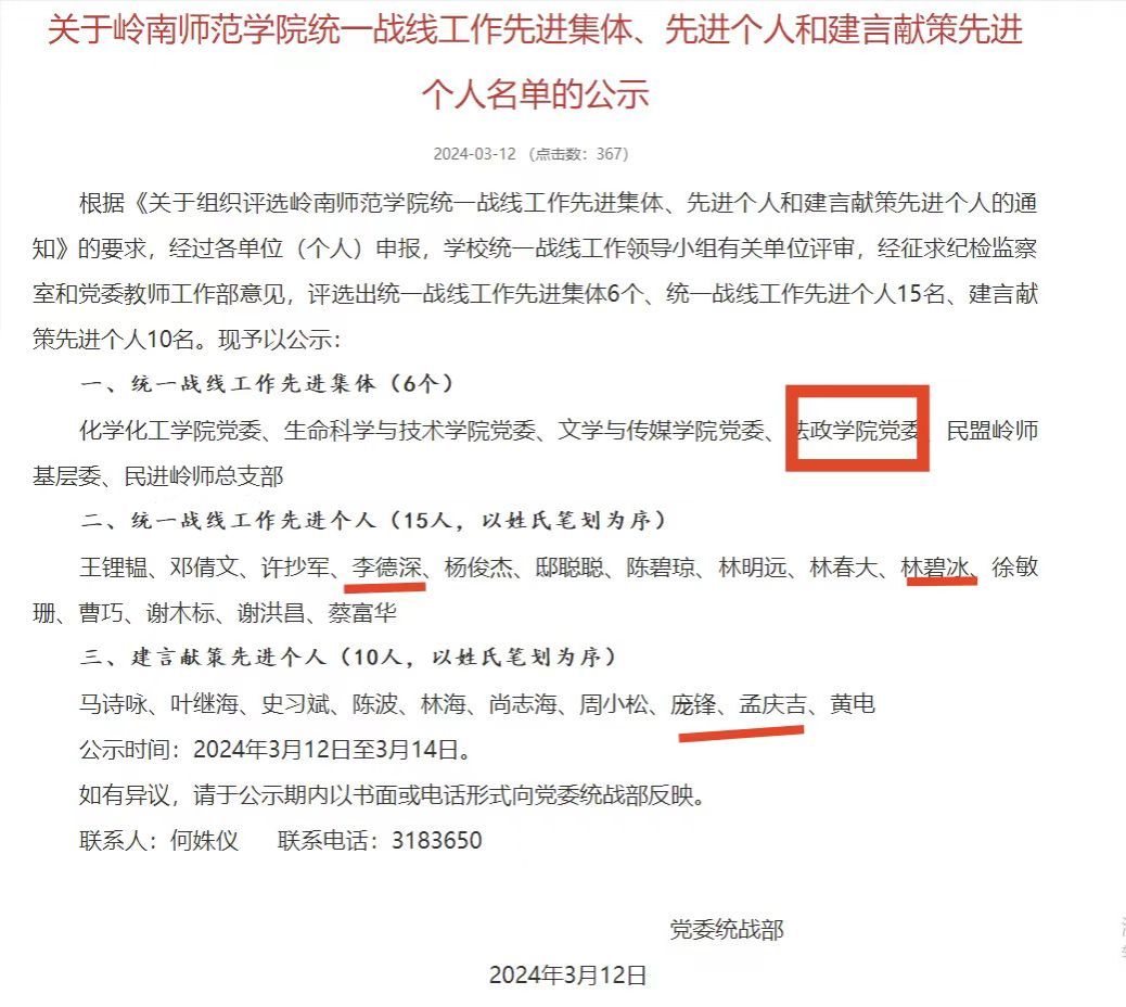 法政学院在岭南师范学院统一战线工作先进集体、先进个人和建言献策先进个人评选中成绩斐然