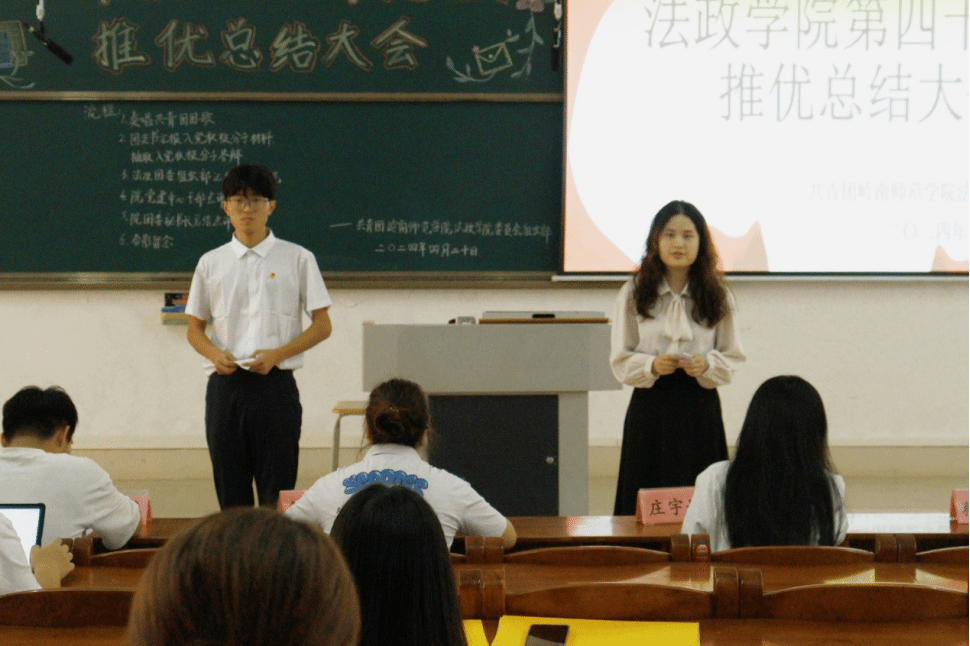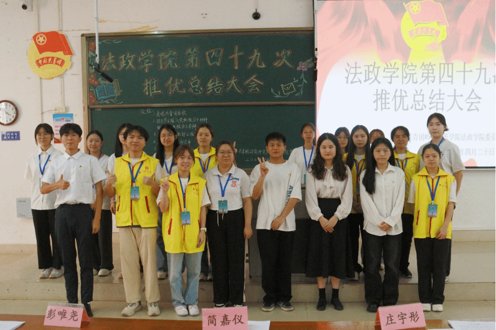 为进一步深化法政学院党建对团建的引领作用,加强对青年团员的理想信念教育,激发团员青年的政治热情,推进“铸魂育人”工程的落实,法政学院于4月20日下午在弘雷楼611室开展了第四十九次推优总结大会。法政学院团委副秘书长简嘉仪,法政学院党建中心学生干部彭唯尧,各二级学院团委组织部干部代表以及法政学院2021级至2023级团支部代表以及73名通过团组织推优的优秀团员参加本次推优大会。
