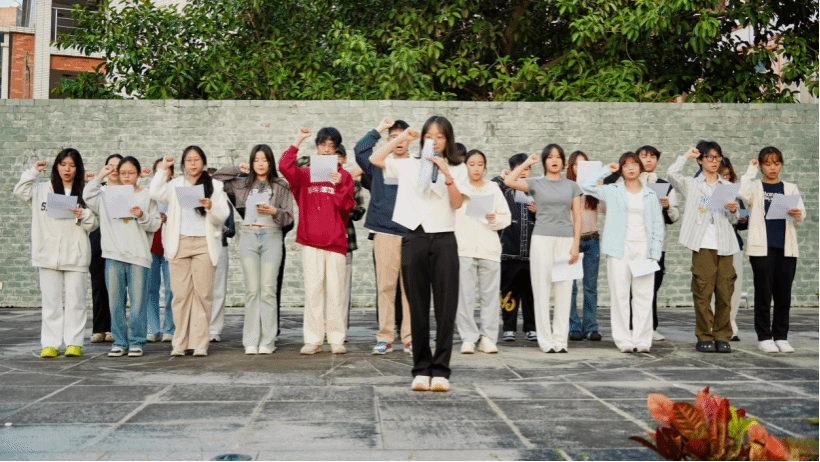 随后,小教员集体宣誓。他们怀揣着对语言文化的尊重与热爱,右手握拳,集体宣读誓词,声音铿锵有力,清晰而又坚定,回荡在师道园的每一个角落,充分展现出小教员们积极向上的精神面貌。