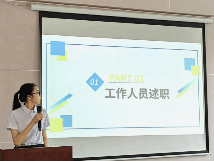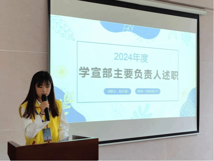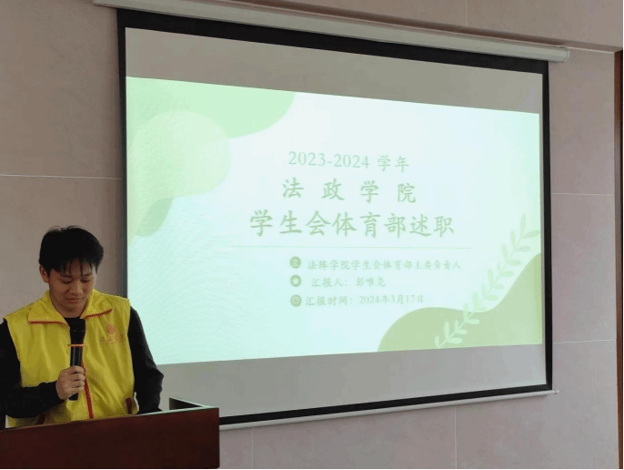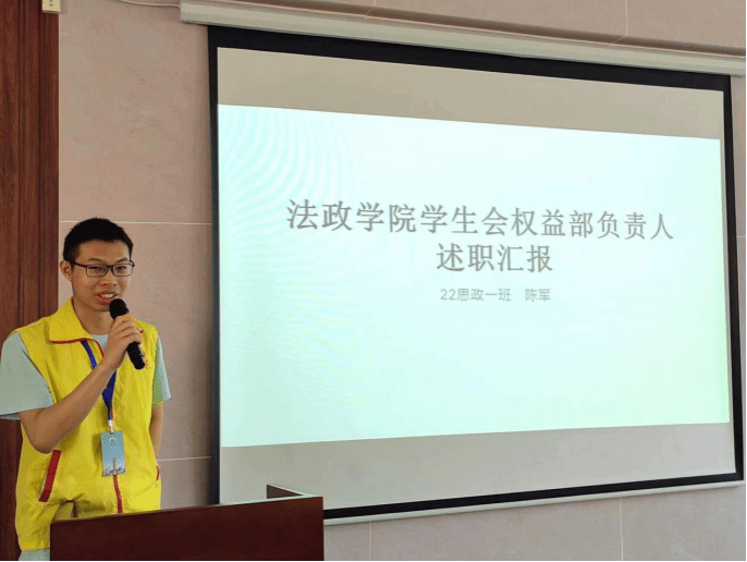 本次会议主要有三项议程,分别是工作人员现场述职、现场评分和老师致辞。法政学院学生会主席团成员与各部门主要负责人围绕政治态度、道德品行、纪律作风、学习情况、工作总结和工作设想六个方面分别进行述职。