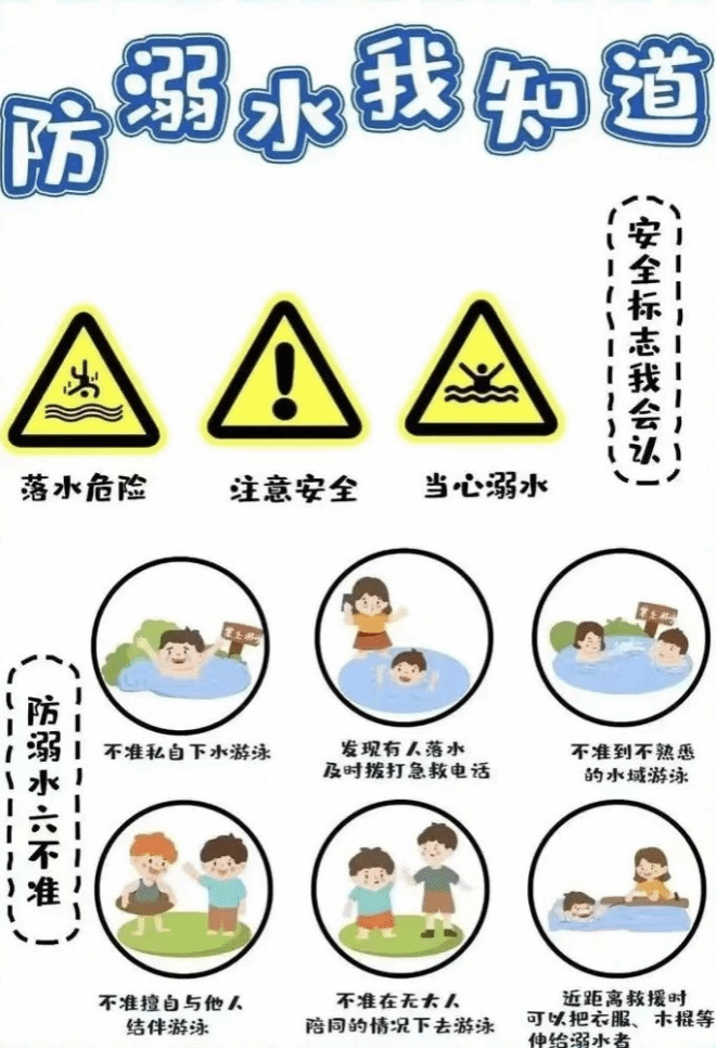 3.注意防溺水。气回暖,同学们注意不要单独或与朋友结伴到水库、河塘玩耍,不到危险水域玩耍,谨防意外落水事故发生。不盲目下水施救,要智慧救援,谨记“六不”原则。学好防溺水相关知识,请务必坚持“预防为主,防范为先”,珍爱生命,关注防溺水安全教育。