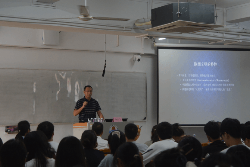 讲座伊始,李云飞教授从高度评价习近平总书记关于中华文明五个突出特性的论述入手,向师生们展示出一副宏大的历史画卷,接着围绕罗马帝国转型下的欧洲众国并立竞逐而非延续帝国一体的学术前沿问题,探讨地理环境决定论、语言文化区隔论、欧亚地缘政治论、古典遗产制约论、基督教会制约论、国家构架模式论,全面考察中古时期欧洲国家(政治体)的类型和关系,认为德法分立是欧洲形成众国分立的关键因素。在微观研究层面,他系统梳理了自843年凡尔登协议至987年加佩王朝建立期间,德法王国内的继承安排以及两国间战争、协议等内容,认为德法分立格局形成是必然的,它对以后的德法关系及其欧洲乃至世界关系都产生深远影响。