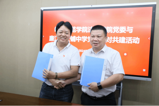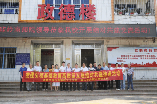 2024年10月9日,法政学院党委书记李德深率队赴廉江市安铺中学开展党建引领基础教育高质量发展结对共建活动,围绕党建引领结对共建的内容与形式进行了深入的交流洽谈,签署了《党建引领基础教育高质量发展结对共建协议书》。这是法政学院党委在与湛江二中海东中学结对共建取得丰硕成果的基础上启动的新一轮党建引领基础教育高质量发展结对共建项目。法政学院副处级组织员黎祎以及历史系教工党支部一行共13人,安铺中学党委委员、校长宋应金及部分校领导、骨干教师参加了结对共建活动。