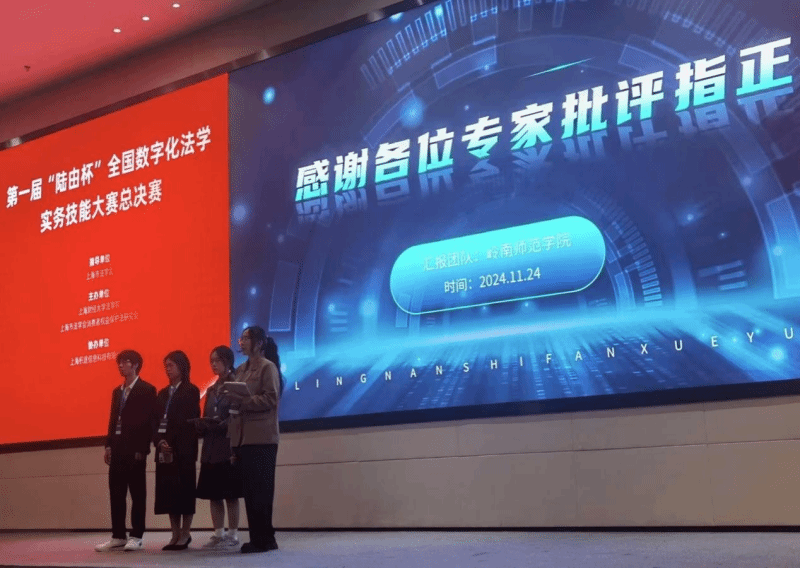 11月24日,总决赛进入第二阶段,学校参赛团队在现场答辩环节,充分展现了扎实的专业功底、良好的综合素养,以及在数字化背景下对新型法律问题的解决路径和法学领域数字化手段应用创新实践发展的思考和见解。他们以实际行动彰显了岭师法学专业学子的创新思维、蓬勃朝气与无限发展潜力,与全国17支高校队伍同台答辩竞技,最终勇夺一等奖的优异成绩,充分展现了岭师学子的风采。