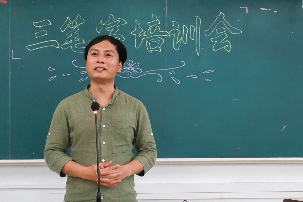 此次培训会卓大老师主要针对比赛书法内容的选择、三笔字的创作、书写存在的问题三个方面进行培训。卓大老师指出,三笔字大赛中出题内容应与优秀传统文化接轨,可选择古代诗词等代表性作品。在三笔字的创作讲解中,卓大老师结合视频对书法作品进行样板讲解,讲授了常见的书法作品款式及创作技巧。此外,他从选手们比赛时容易出现的书法问题入手,提醒同学们在毛笔比赛中要注意繁体字的书写和墨色的变化,必要时可以准备一张稿纸在试纸上进行样板创作。在硬笔书写过程中,要注重字体的大小以及书写格式的规范化。