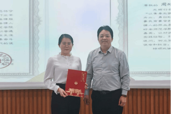 湛江市中级人民法院二级法官周冰清(2005级校友)以“守正义之魂,赴法治之约”为题讲述了自己从法学生到法官的16年职业生涯,分享了法官职业的“三级跨越”。她指出,职业成长需要经历“职业准备期”、“职业准入期”与“职业成熟期”三个阶段,并强调大学期间培养法学专业学习兴趣与法律实践能力的重要性,鼓励师弟师妹珍惜旁听庭审、参与专业见习等实习机会,将理论知识与实践结合起来。她表示法官职业需要理性思维、责任担当、法治信仰与悲悯之心,并通过案例让在场的师弟师妹深刻认识到“法律不是冷冰冰的条文,而是有温度的守护”的深刻含义。最后,她寄语同学们要“以青春赴使命,以法治护家国”。