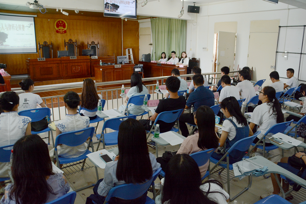 6月2日上午,由我院学生法学会主办的第八届公诉人与律师论辩赛决赛于弘雷楼708室模拟法庭举行。特邀广东朝胜律师事务所律师吕汝奋、广东领会律师事务所律师谢明演、湛江市人民检察院公诉二科科员车惠余担任评委,我院学生会主席陈天伦以及广东海洋大学我院团学干部代表担任嘉宾出席。