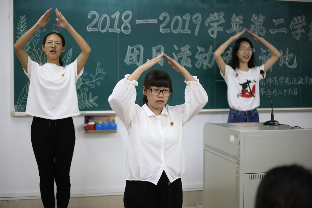 一曲澎湃激昂的共青团团歌合唱拉开了此次活动的序幕。在决赛现场,各团支部讲解员通过PPT演示的方式就前期准备、活动现场、活动特色、活动反思以及活动意义等五个方面进行团日活动的概况介绍。为增添竞演的趣味性,各支部在讲解中穿插情景演绎、手语表演以及诗歌朗诵等节目,多样的形式与生动的内容给现场观众留下了深刻印象。其中,16社工2团支部带来的手指舞表演《中国很赞》、歌曲奏唱《我和我的祖国》以及“中国新四大发明”的手工模型,突显了别具一格的团日活动风貌和专业特色,把现场欢欣活跃的氛围推向至高潮。