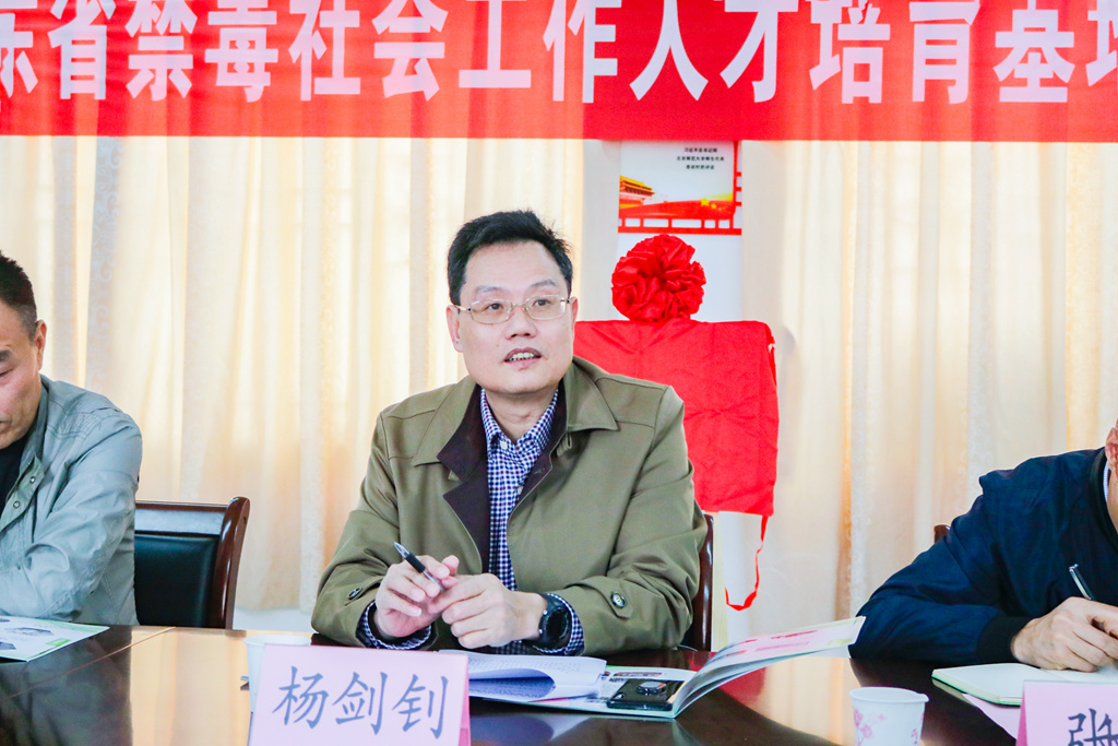 杨剑钊副处长代表省禁毒局作发言,杨剑钊副处长介绍了广东省的禁毒工作现状,表达了禁毒领域对禁毒社工人才的渴望,对基地建设提出了殷切的期待,鼓励项目团队立足本地,依托学校优势,培养出更多符合时代要求的禁毒社会工作人才。