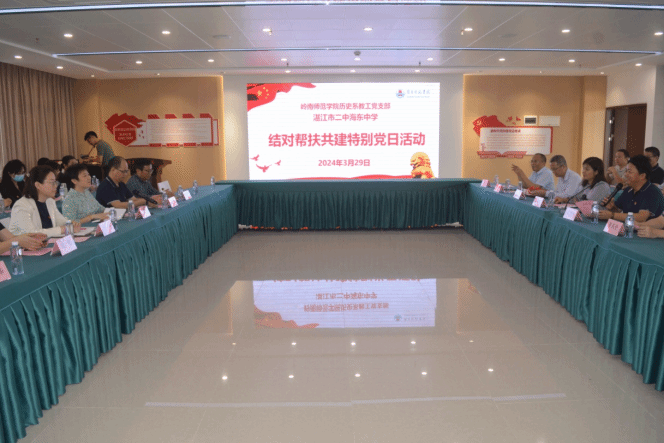 3月29日,法政学院党委邀请湛江二中海东中学党总支莅校,在学校党群统战服务中心联合开展共建特别党日活动,以进一步推进“党建引领粤西基础教育高质量发展”项目建设和“大中小学思政一体化”共建工作。特别党日活动由法政学院党委书记李德深主持,学校党委组织部副部长诸桂英同志应邀出席并作指导,法政学院党委领导和历史系教工党支部党员代表,以及海东中学党总支领导和各支部党员代表参加了活动。