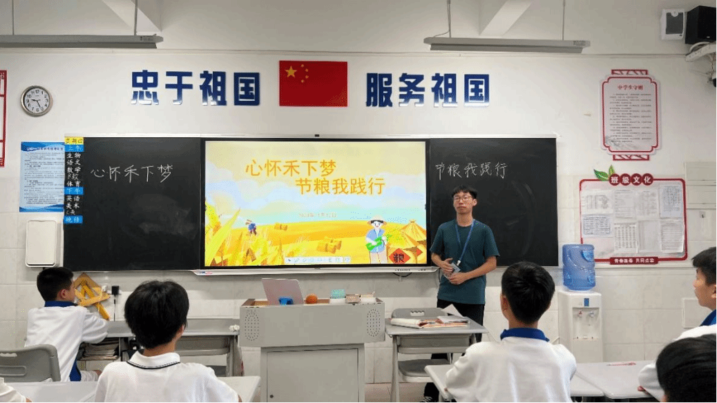 民以食为天,食以粮为先。为了弘扬勤俭节约的传统美德,鼓励青少年发挥青年先锋作用,争做节约粮食的宣传员和践行者。本周,法政学院第二十一期“给你阳光”校外辅导活动的志愿者们在湛江市寸金培才学校为初一年级的培才学子们开展了以“心怀禾下梦,节粮我践行”为主题的特色班会课。