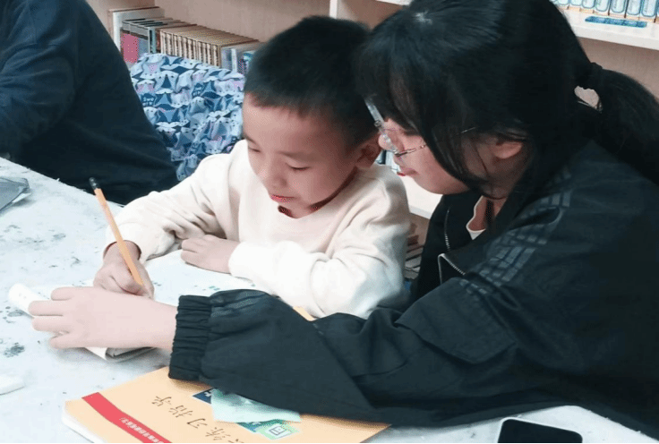 (志愿者辅导孩子写作业)