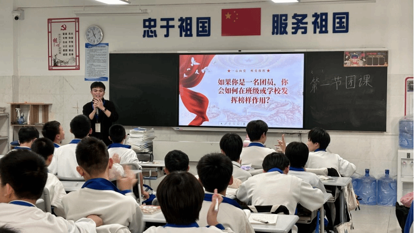 随后,授课辅导员围绕共青团的基本知识展开讲解,重点介绍团的宗旨、团员的权利与义务、团歌、团徽以及入团流程等内容,帮助学生初步树立团员意识。在互动环节中,授课辅导员以“假如你是一名团员,你会如何在班级或学校发挥模范作用”为题,与同学们展开讨论。学生们踊跃发言,展现了新时代青少年的责任感与使命感。