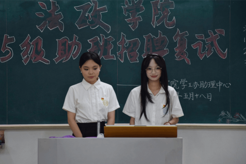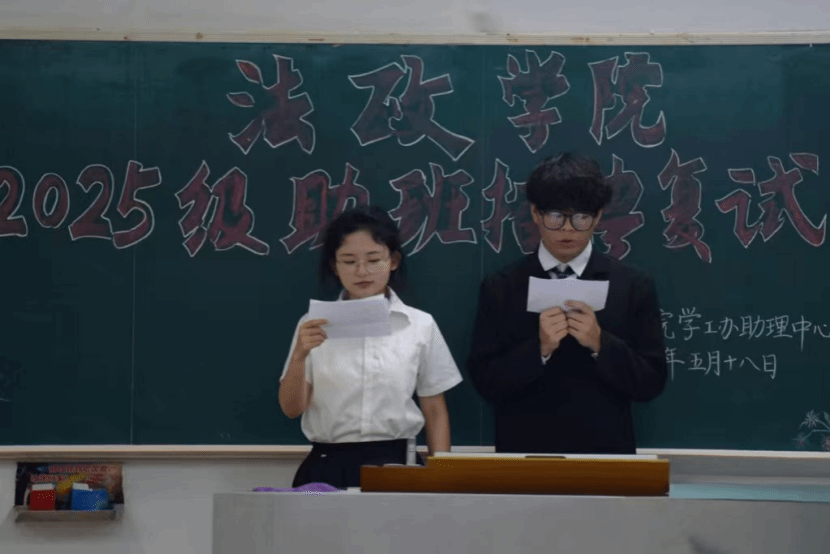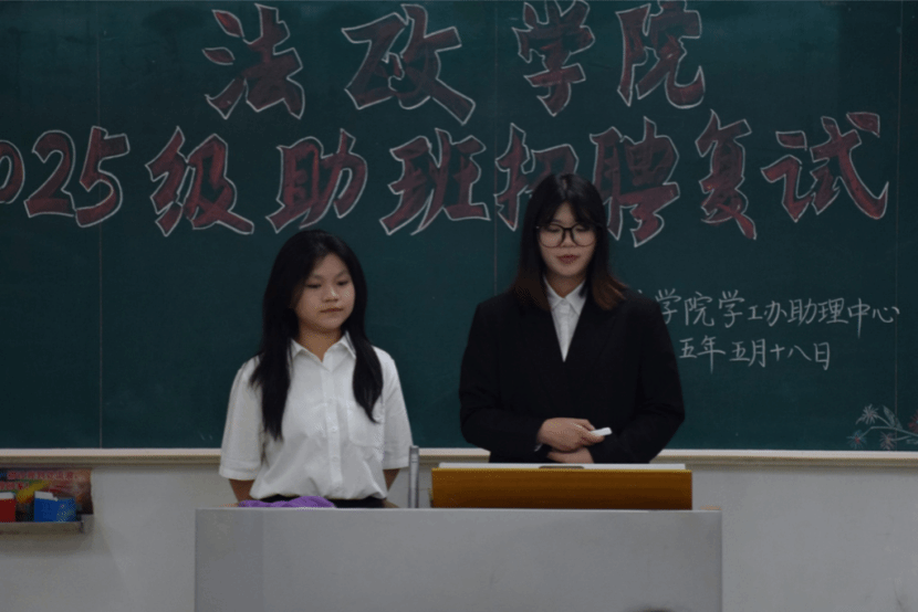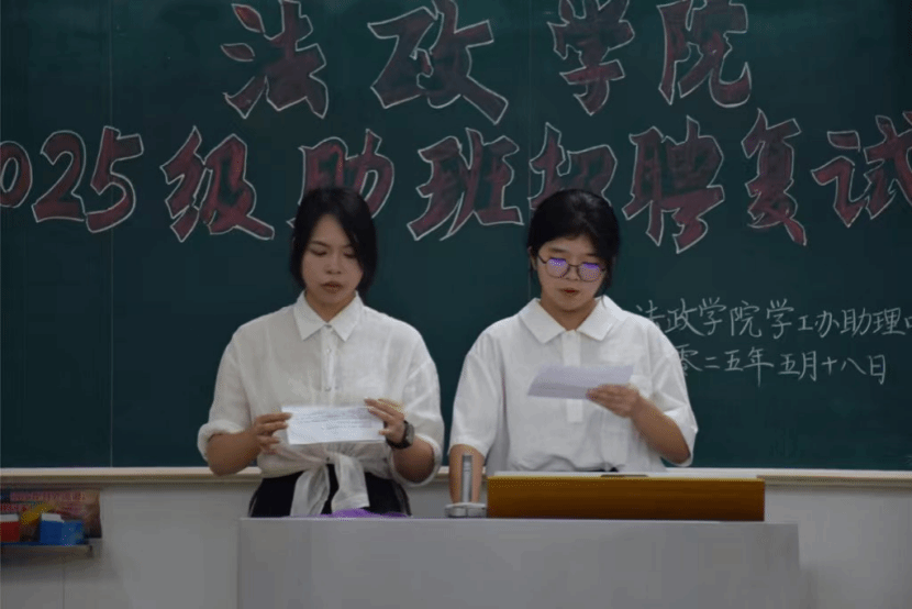 为积极落实立德树人根本任务,高效推进新生入学教育工作,充分发挥优秀学生的榜样引领作用,助力2025级新生平稳且快速地融入大学生活,法政学院筹备并开展了2025级助理班主任招聘活动。经过个人报名、书面材料评选、笔试等环节,5月18日晚,在弘雷楼205室顺利开展2025级助班招聘复试活动。法政学院辅导员侯美、学工办助理中心指导老师张芸凤应邀参加本次活动,并担任本次复试的评委。