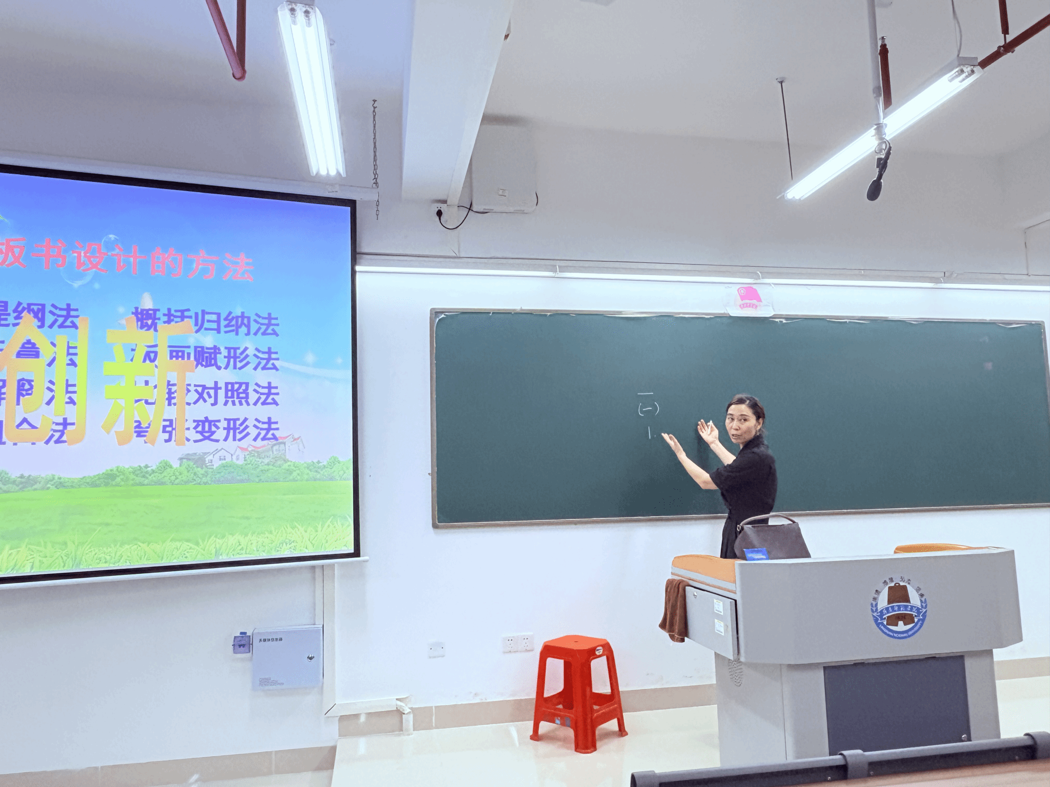 教学中,滕松艳老师阐述板书设计在师范生培养中的作用。板书作为课堂教学的关键部分,是教师教学思路的可视化呈现,也是学生梳理知识框架的重要依据。规范、美观、合理的板书,能吸引学生课堂注意力,提升教学质量,还能影响学生审美与书写习惯,关系师范生未来的职业发展。