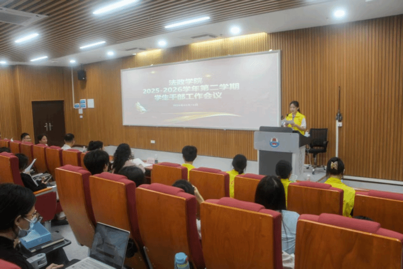 为全面推进新学期学生工作提质增效,强化学生干部队伍建设,增强服务意识、提升综合素养,法政学院于3月16日在第五教学楼A栋102室开展2025-2026学年第二学期学生干部工作会议。法政学院党委副书记易贤、全体辅导员老师、学院各机构主干、各班班长、团支书、以及先进班集体代表参加会议。会议由曹乐诗主持。
