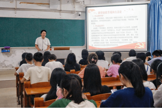 李德深书记首先阐述了世界观和方法论的概念,接着讲述什么是科学的世界观和方法论,以及科学的世界观和方法论的重要性,指出我们必须认真深入学习习近平新时代中国特色社会主义思想的世界观和方法论的讲话和论述,并落实到大学四年学习生活中去,形成良好的“三观”,掌握科学的世界观和方法论,为自身的发展做好准备,为实现中国式现代化作准备,为中华民族伟大复兴贡献自己的力量。随后,李德深围绕党的二十大报告中的“六个必须坚持”进行讲解,并对同学们提出了六点要求:一是坚持人民至上,作为大学生要摒弃精致利己主义,努力成为一名为国家、为人民、为大众的新时代青年;二是坚持自信自立,要树立专业自信、个人自信,在大学中学会独立思考、独立自主发展;三是坚持守正创新,大学生既要坚持正确的、主流的中华优秀传统文化,也要敢想敢干敢创新,与时俱进,解决卡脖子问题;四是坚持问题导向,无论是在工作还是学习中都要学会寻找问题、思考问题、解决问题;五是坚持系统观念,作为大学生要有大局意识,要有合作意识与分工意识,要有集体观念和团队精神,杜绝自私自利的个人主义,重视集体荣誉感;六是坚持胸怀天下,作为大学生要树立世界眼光,要有家国情怀,更好把国内发展与对外开放统一起来,把个人发展与国家发展结合起来,把中国发展与世界发展联系起来,把中国人民利益同各国人民共同利益结合起来。