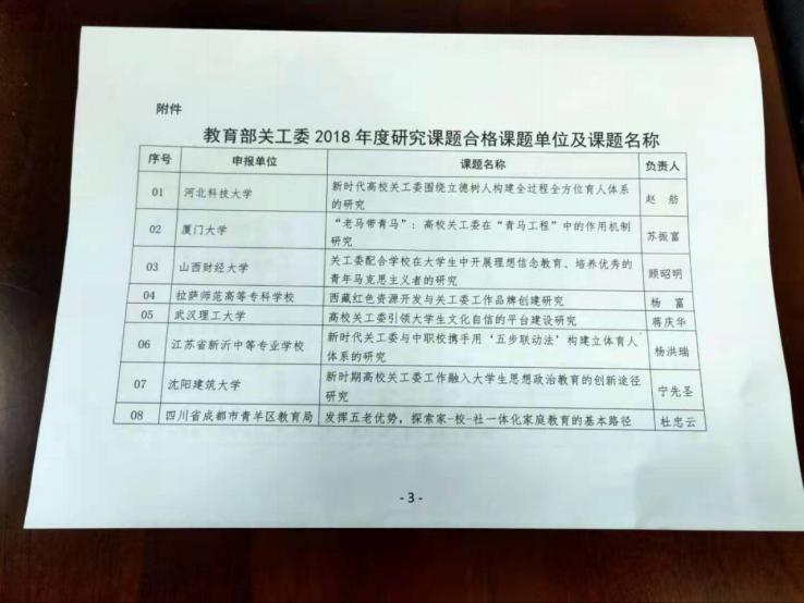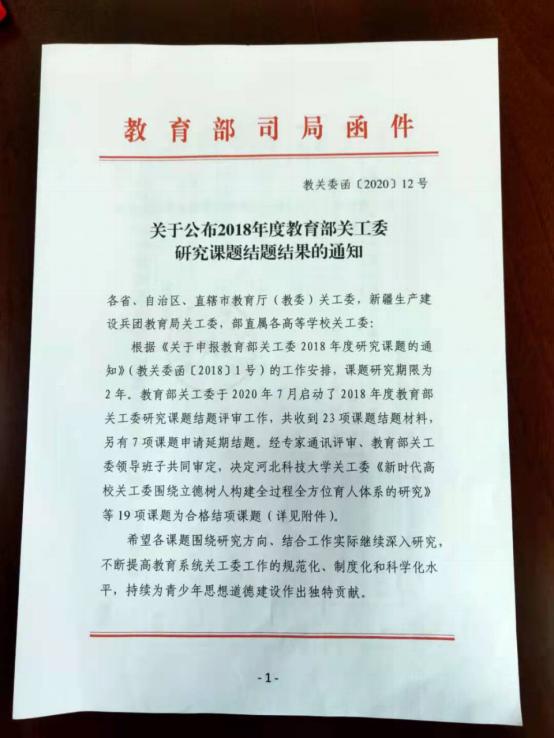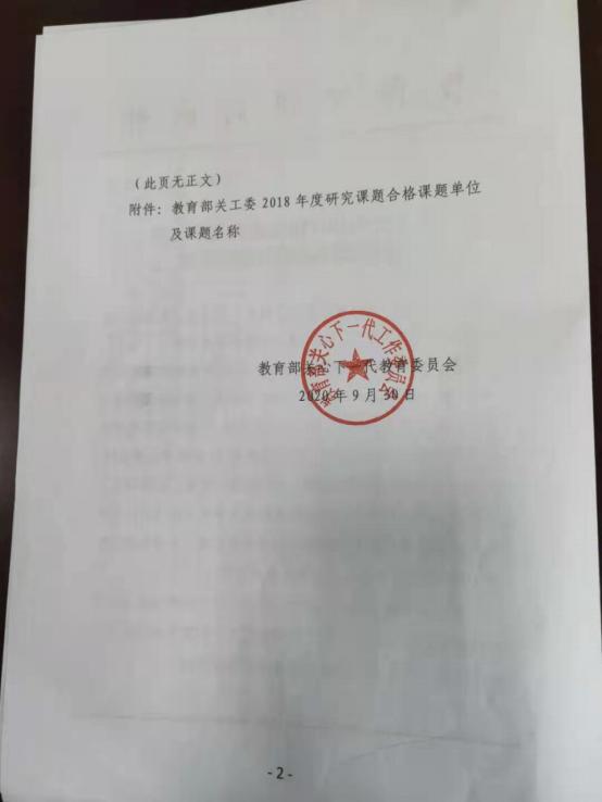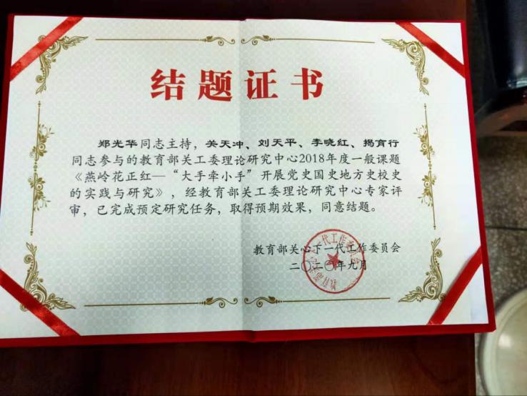 近日,我校关工委收到教育部关工委寄来《关于公布2018年度教育部关工委研究课题结题的通知》和《结题证书》。由我校关工委郑光华老师主持,关天冲、李晓红、刘天平、揭育行等老师参与的课题《燕岭花正红—— “大手牵小手”开展党史国史地方史校史的实践与研究》,经专家通讯评审、教育部关工委领导班子共同审定为合格结项课题。